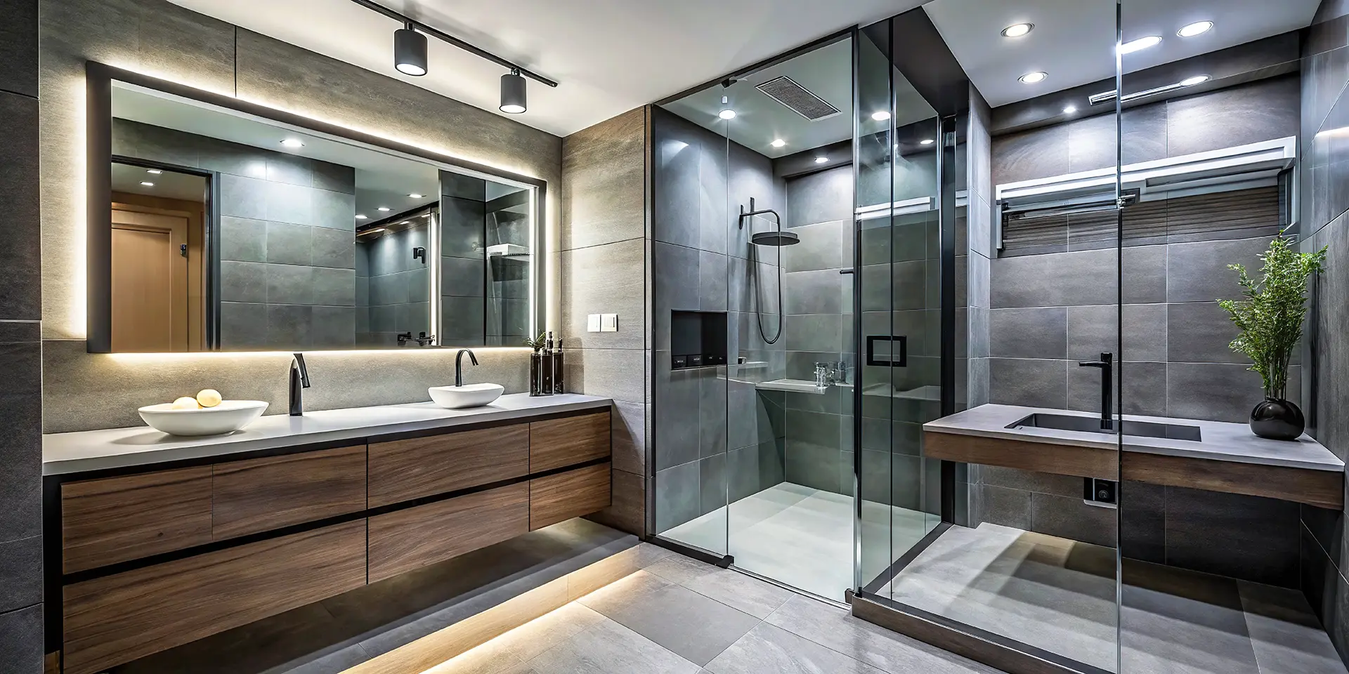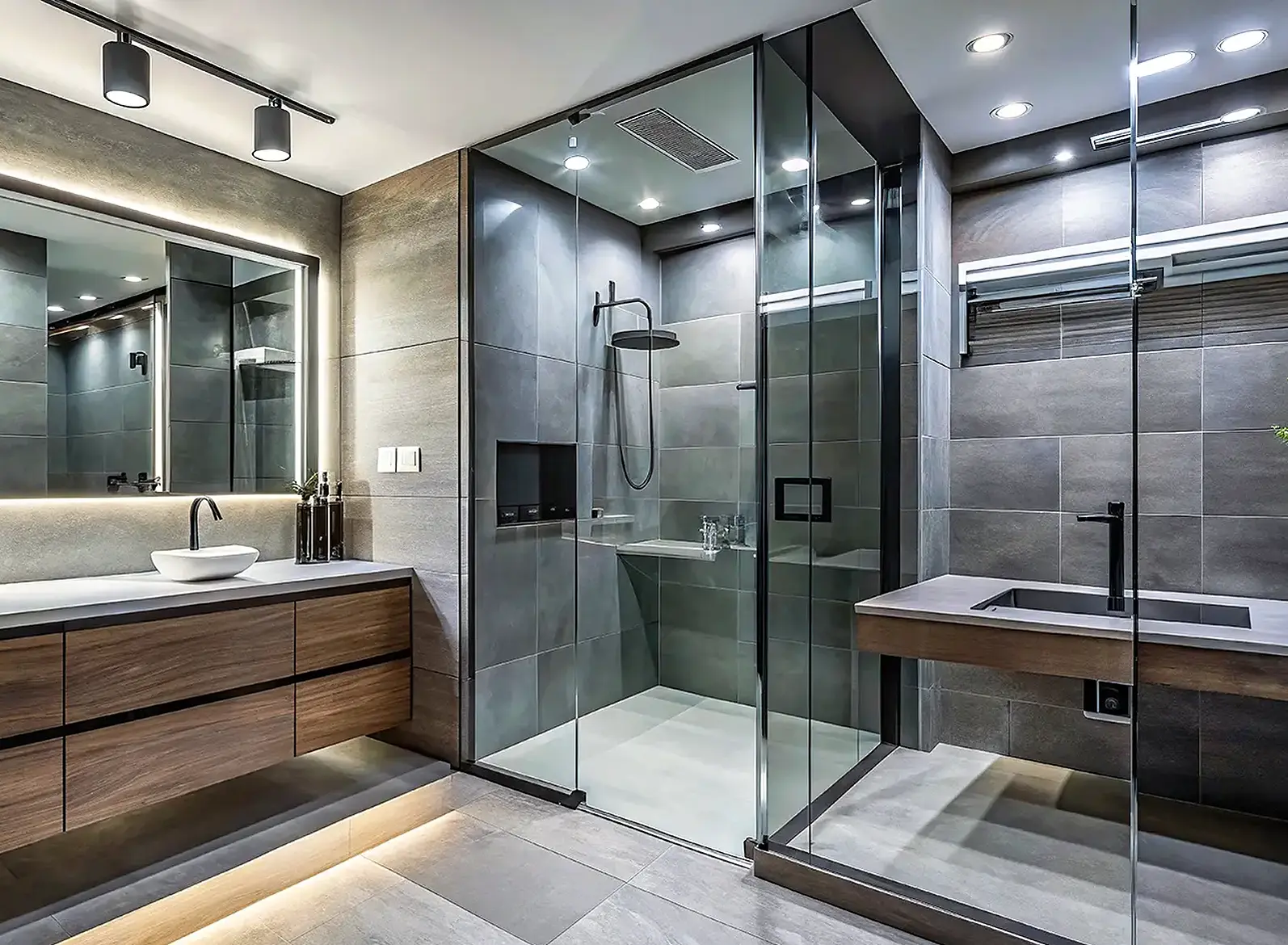 Instal·lació d’una mampara fixa de vidre temperat transparent, integrada en un bany d’estètica moderna i minimalista.