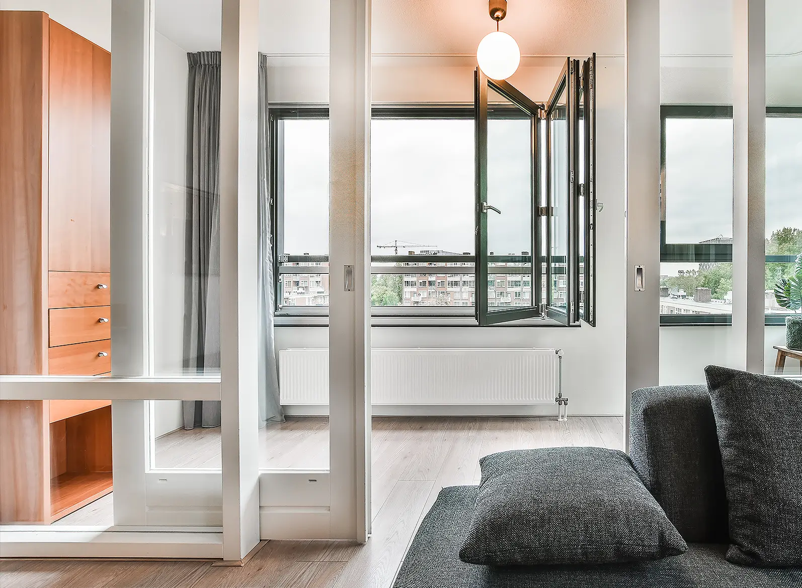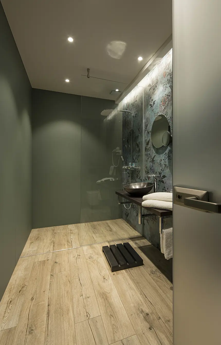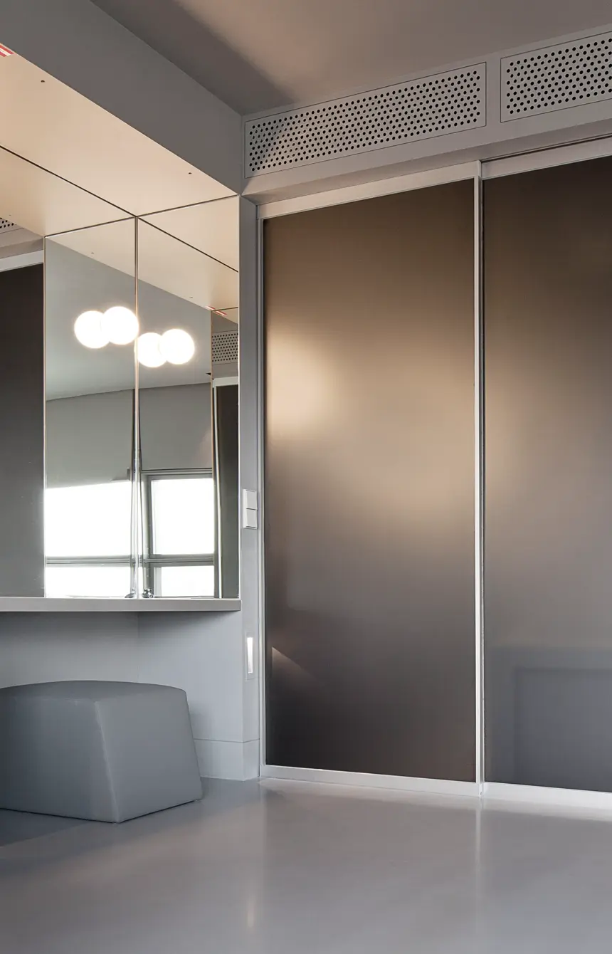 Instal·lació de portes corredisses de vidre opac per a la separació funcional i estètica d’espais interiors en una suite de l’hotel Sofitel Vienna.