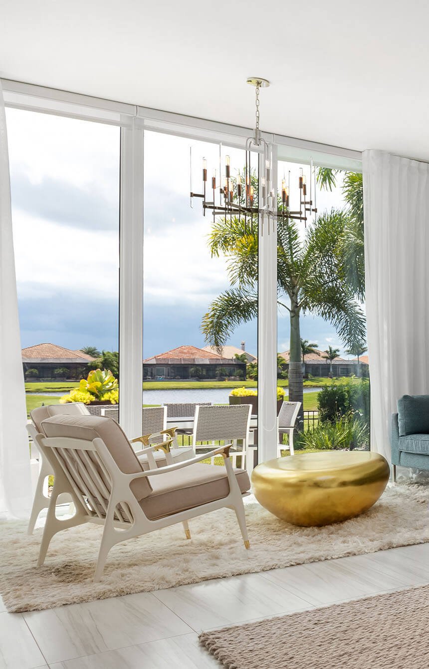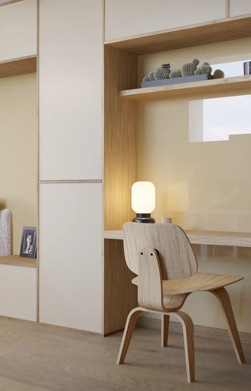 Creació d’un conjunt de mobiliari funcional i decoratiu utilitzant panells de vidre en un habitatge d’interiorisme acurat i estil contemporani.